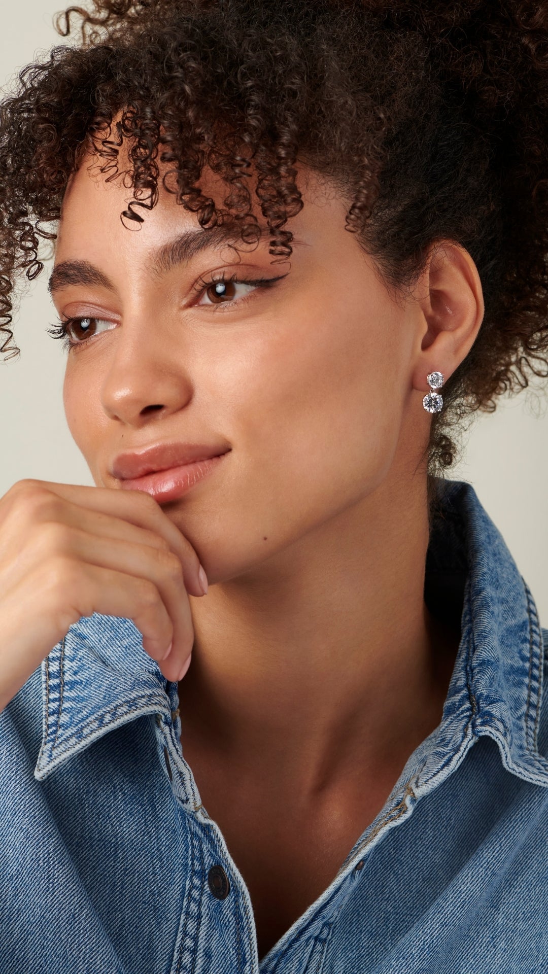 A cute double round drop earring crafted in 9K White Gold, this pair features two round brilliant cuts. Wear it as a bridal adornment or to dress up your everyday look. The model wears 3-carat total equivalent stones.