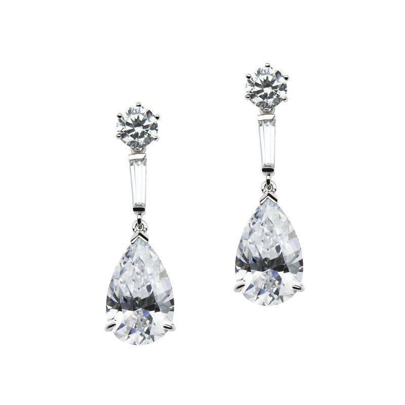 These beautiful drops with 3ct eq. pear stone hang from a 0.3 ct eq. baguette that is attached to the lobe. Making them a little longer than most, but still cute enough to make an impression.