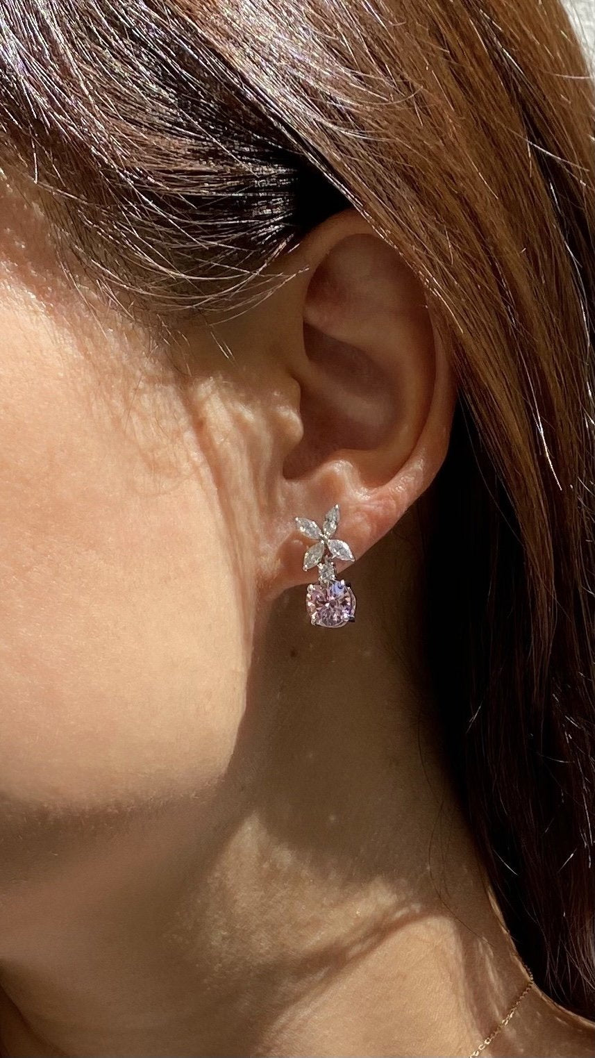 These beautiful drops feature a Round Brilliant in a light pink hue of lab-created pink sapphire. With a total drop of 2 cm, this piece guarantees instant glamour to complete your look for your next social gathering.