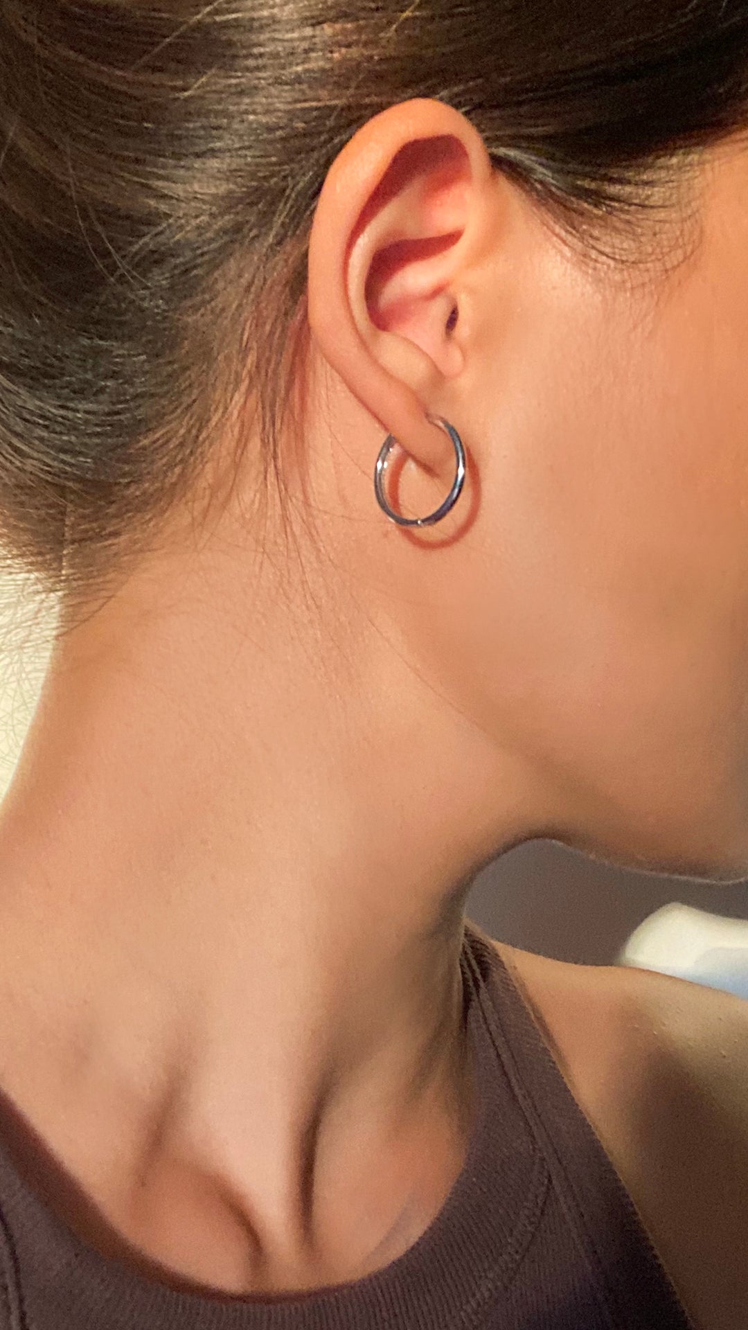 A beautiful pair of essential hoops in polished 9K white gold. Not too small, not too big, this everyday pair features a hidden invisible lock mechanism for a seamless look when worn. A staple pair for every jewellery collection. Style these hoops with your everyday wardrobe. For a larger hoop size, try the Viola hoops.