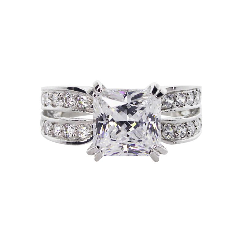 An eye-catching princess cut takes centre stage on a double band design comprised of shimmering channel set round brilliant stones set in polished 9K white gold.