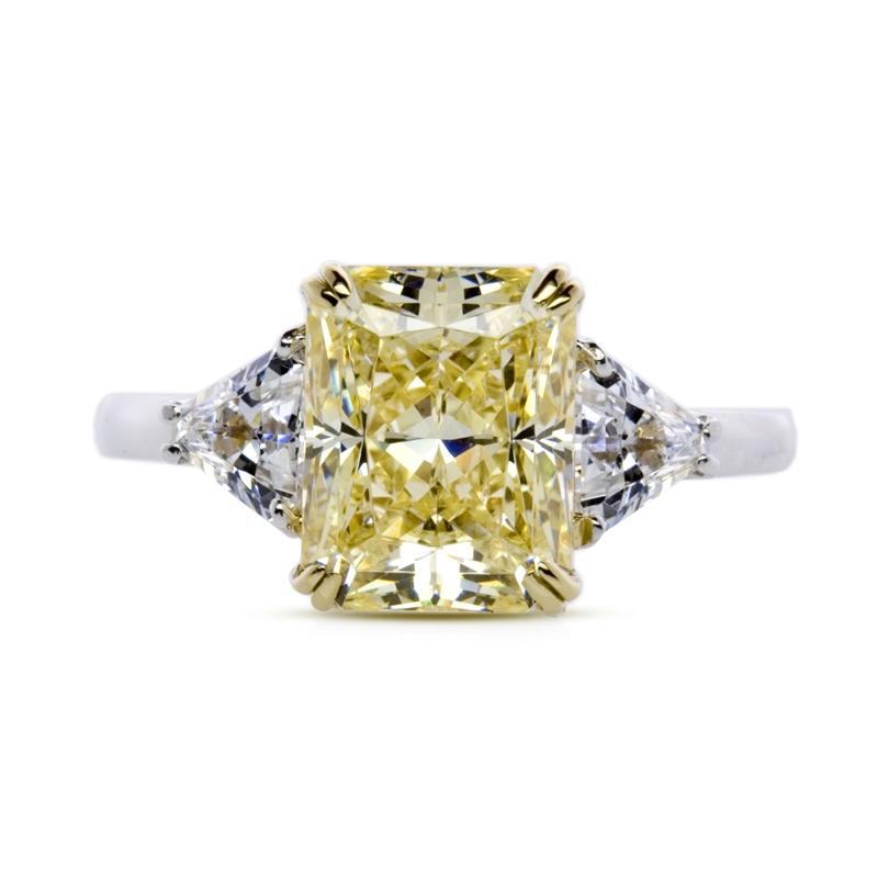 This ring features a Radiant cut main stone and 2 Triangle cuts stones. Our Radiant cut has 70 facets and is truly one of our most brilliant cuts. The crown section includes a Brilliant and Step cut arrangement and the overall look is one of bewildering light and colour.