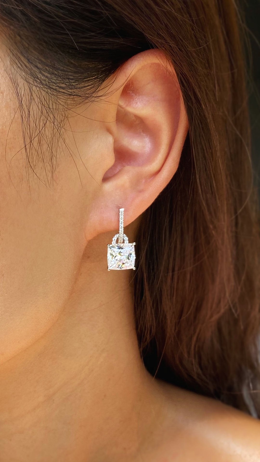 This glittering pair of drop earrings features a 4 ct eq. modified cushion cut as a main stone with total drop of 2.2 cm. Tiny microsettings add a hint of extra light. Reach for these for your next evening engagement.