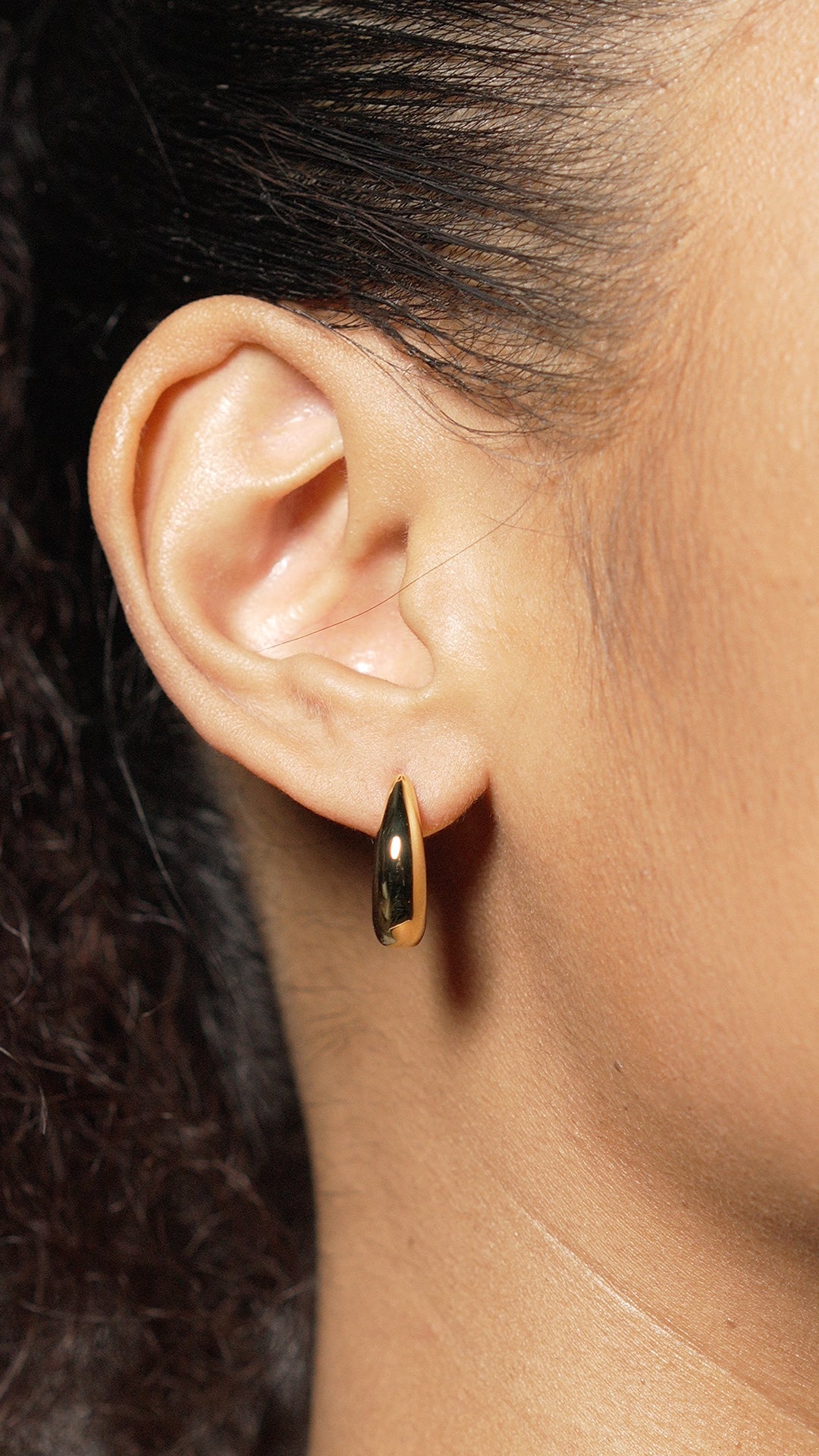 A classic gold hoop earring. The polished horseshoe shape feels elegant and timeless. A filled-in hoop feels slightly more weighted and elevated than other hollowed-out styles. They are finished with a slick, secure closure design. Wear confidently all day, every day.
