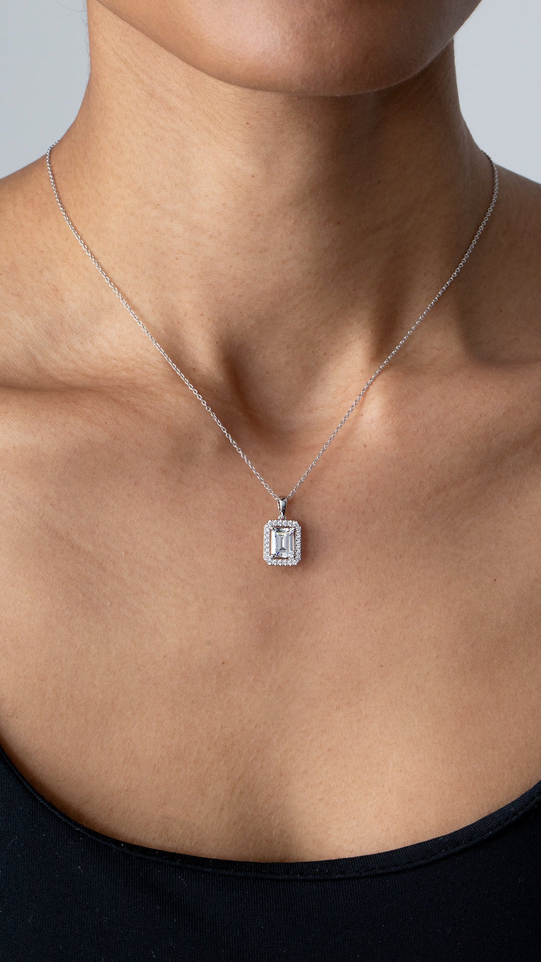 Elegant and chic, this pendant necklace boasts a beautifully handcrafted baguette cut surrounded by a halo of tiny stones.
