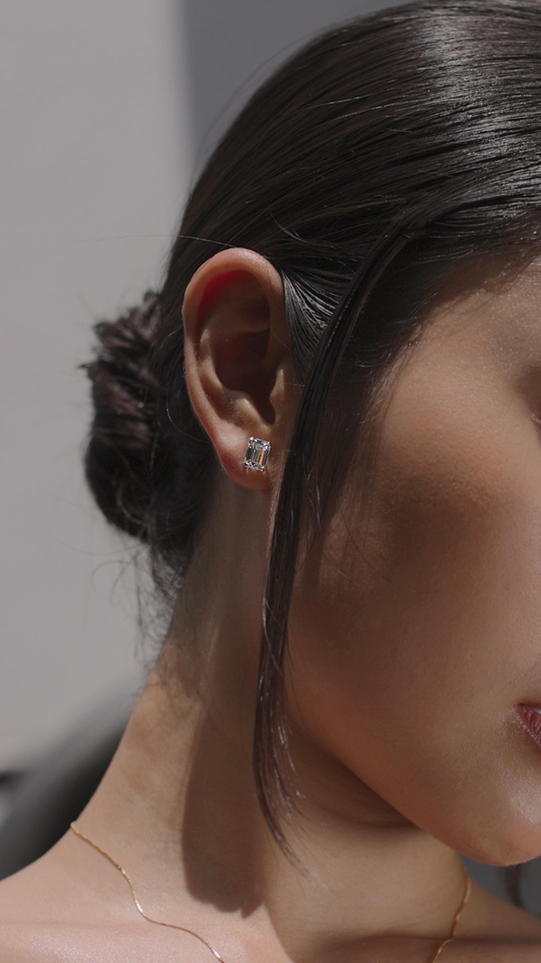 These timeless studs will remain a staple pair for years to come. Crafted in a 9K White Gold double prong mounting and featuring intricately cut and polished emerald-cut stones, these are the perfect pair to add a sophisticated touch to your look from day to night.